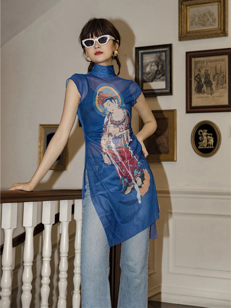 Blue Buddha Print Mesh Turtleneck Blouse