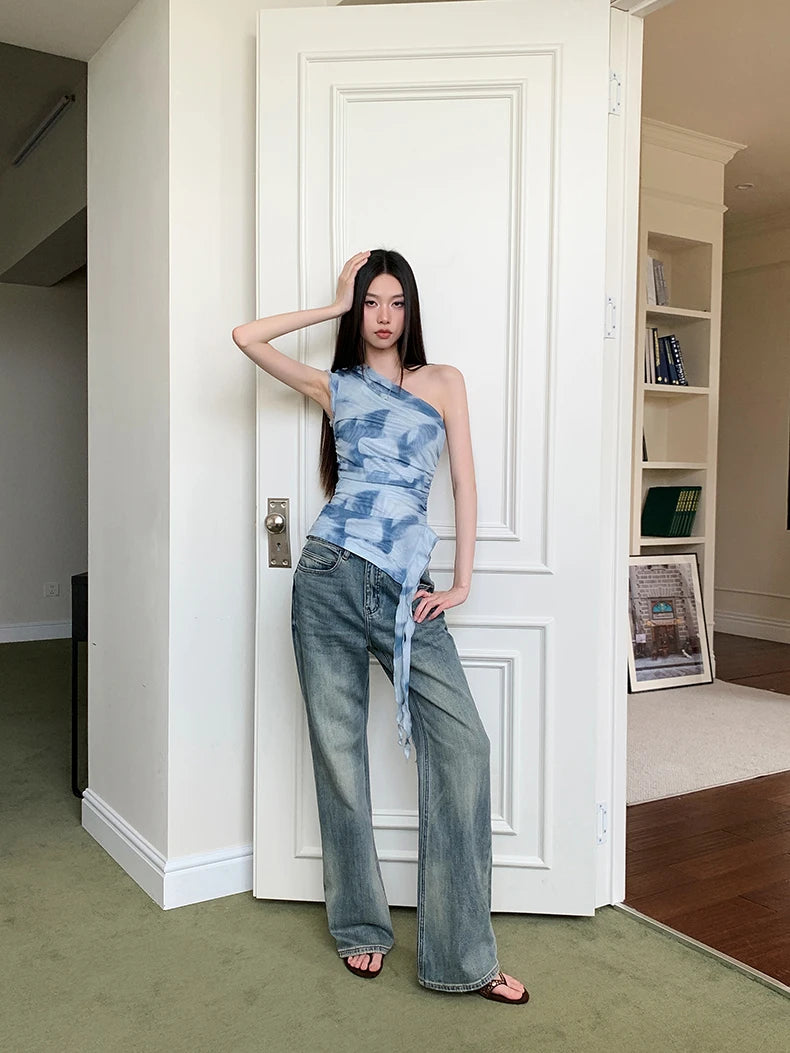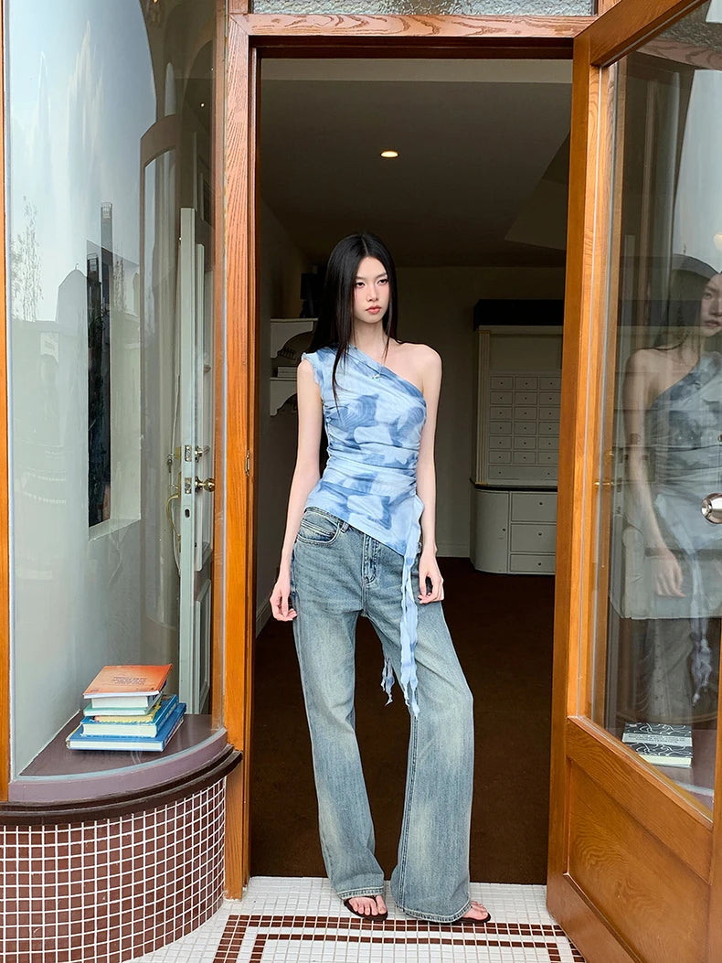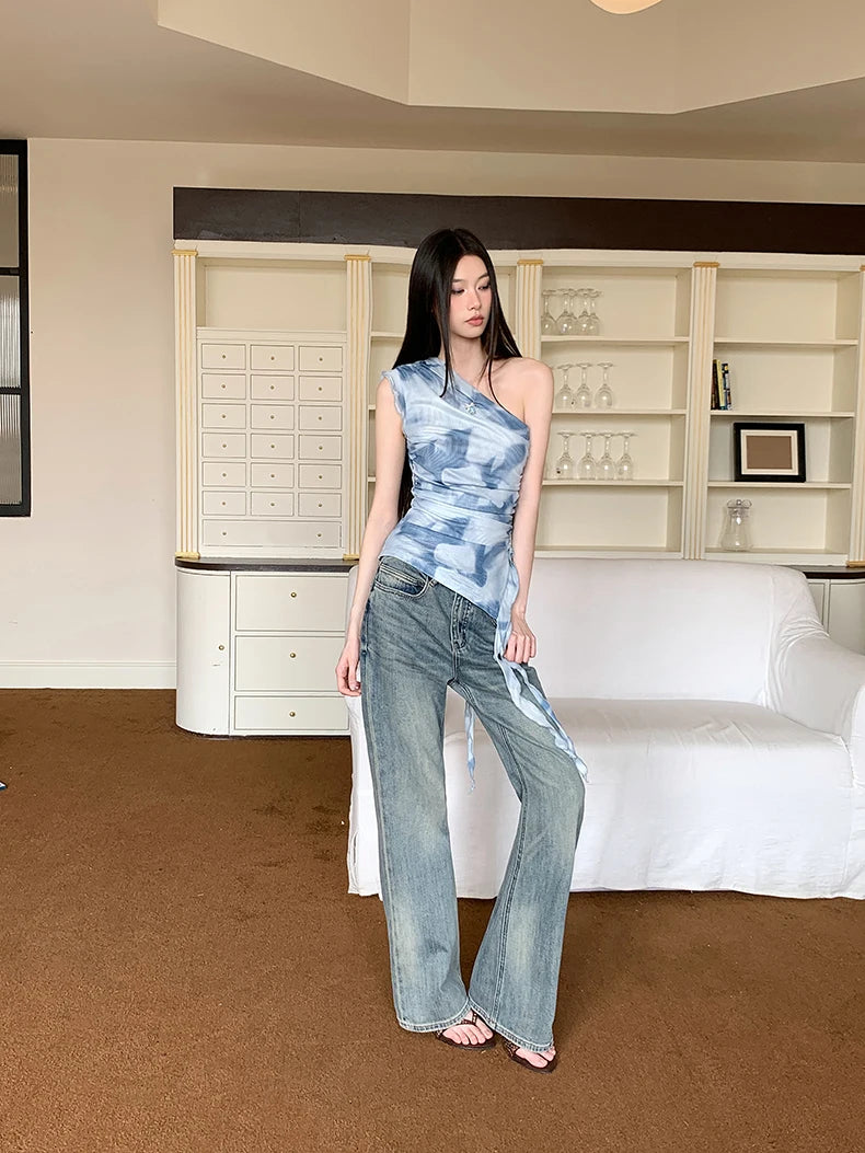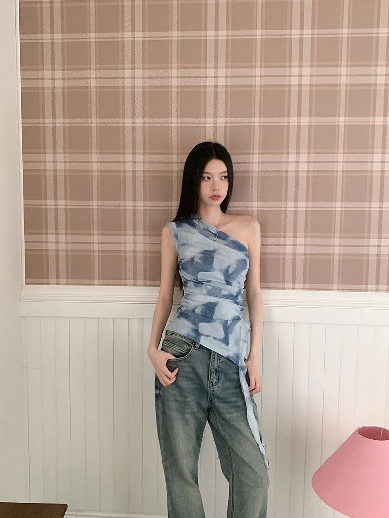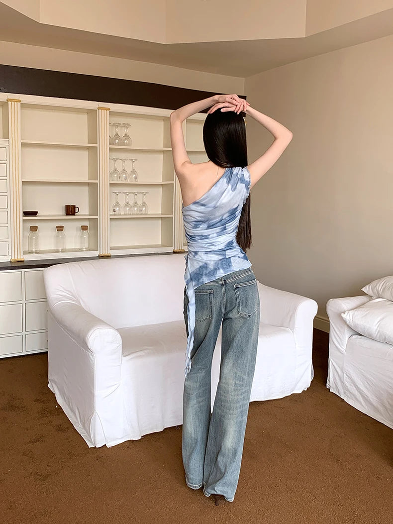 Blue Tie Dye Mesh Off Shoulder Blouse