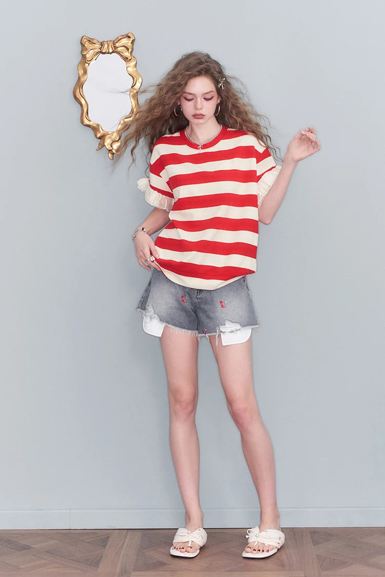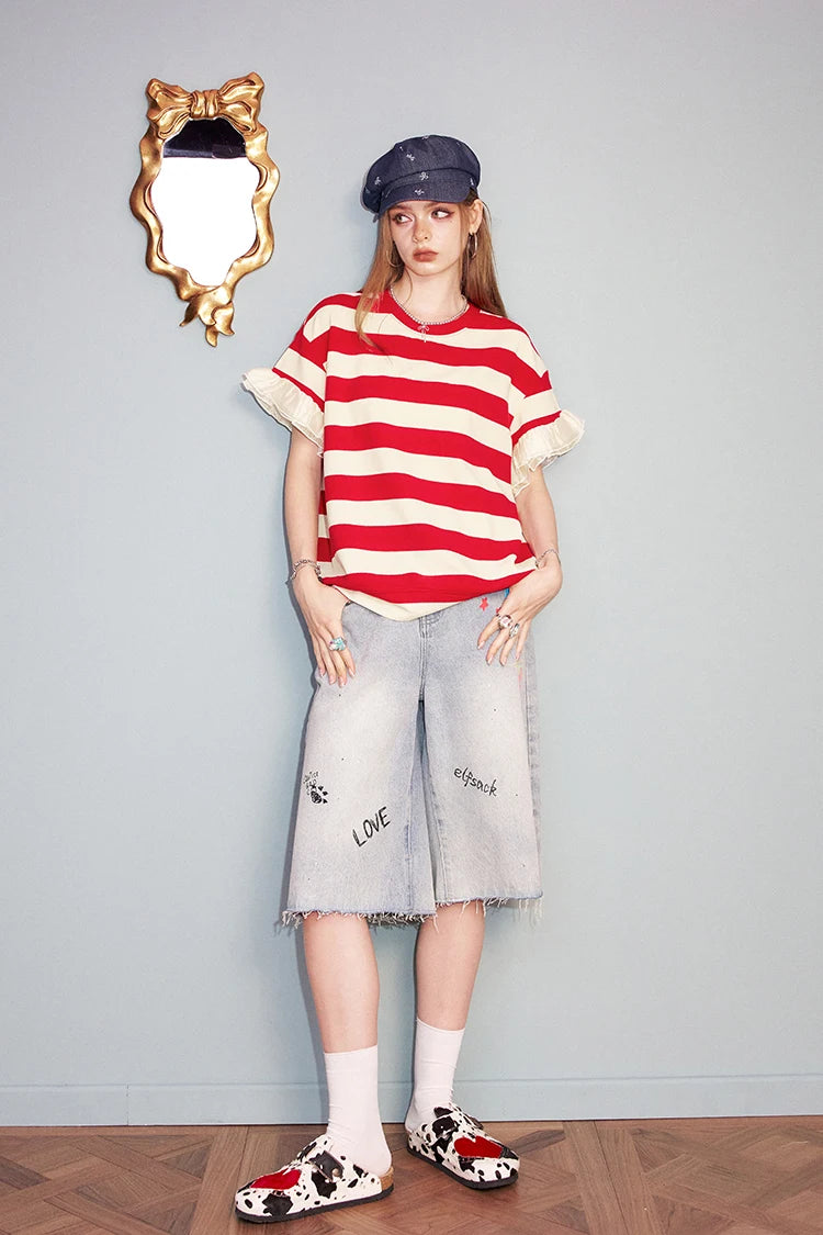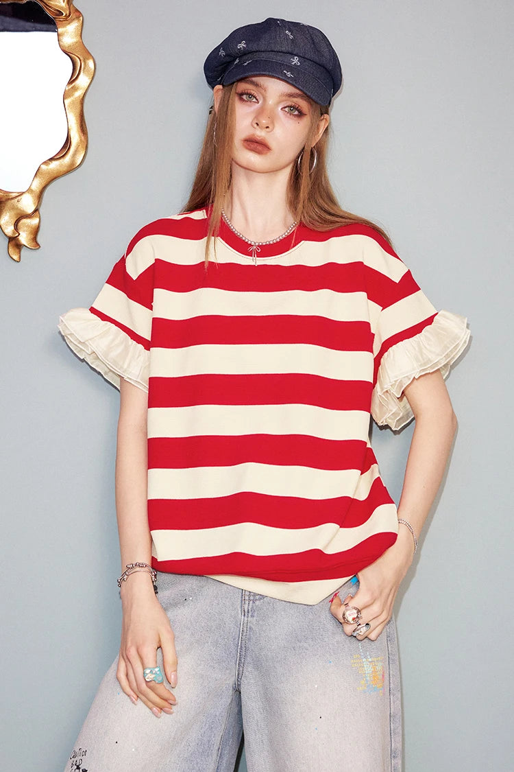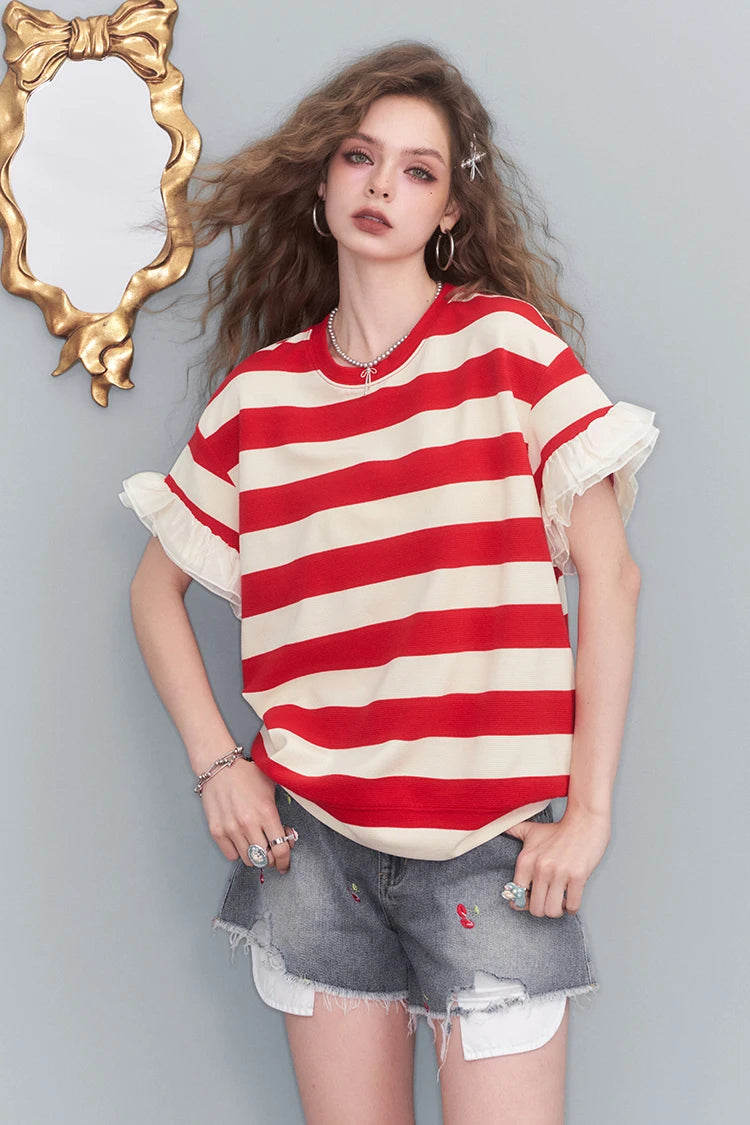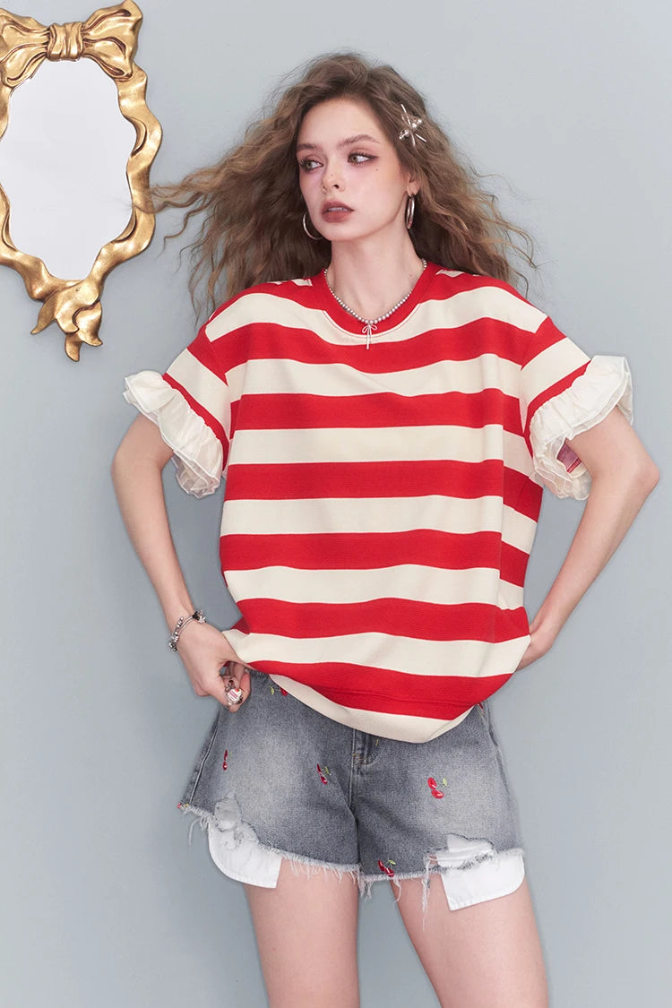 Colorful Stripe Mesh Splice Loose T-Shirt