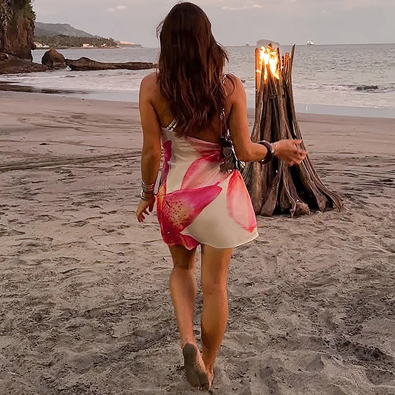 Mozision - Vestido mini sexy con estampado de un hombro sin espalda para mujer, nuevo vestido de verano con aberturas, sin mangas, fruncido, para playa, club, fiesta