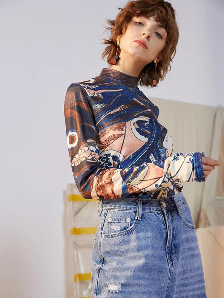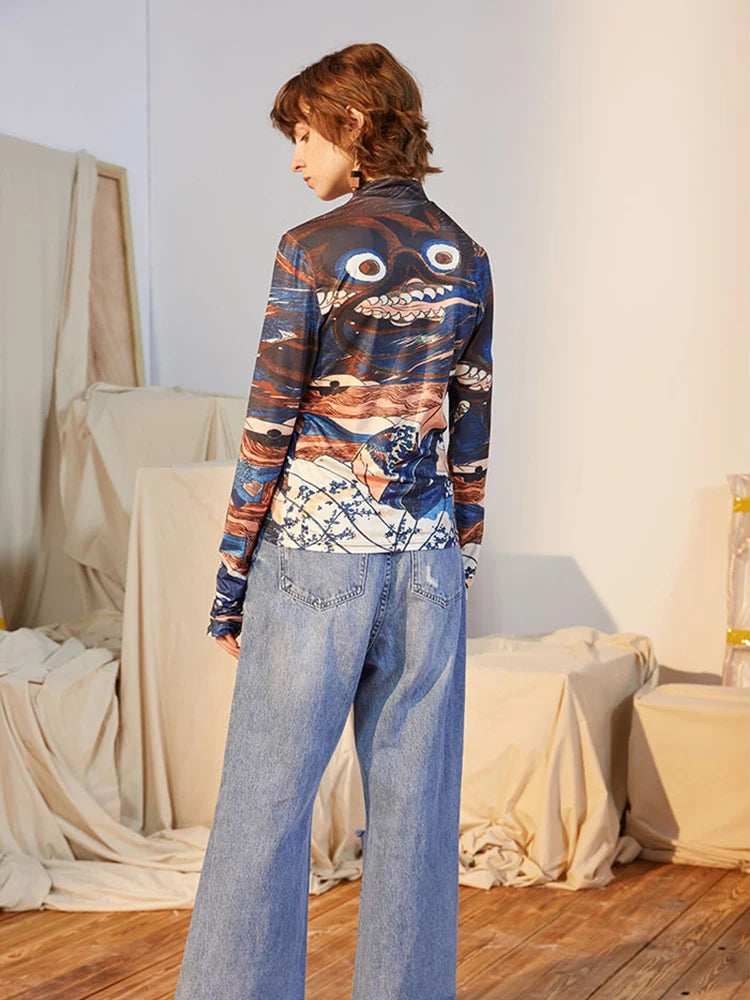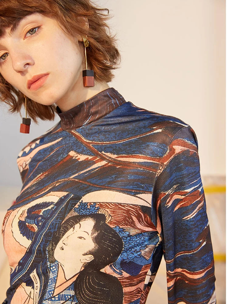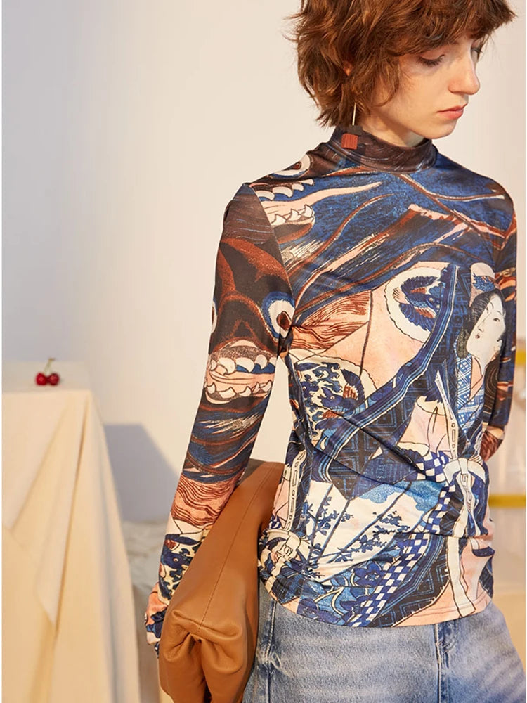 Blue Ukiyoe Designer Turtleneck Long Sleeve Top