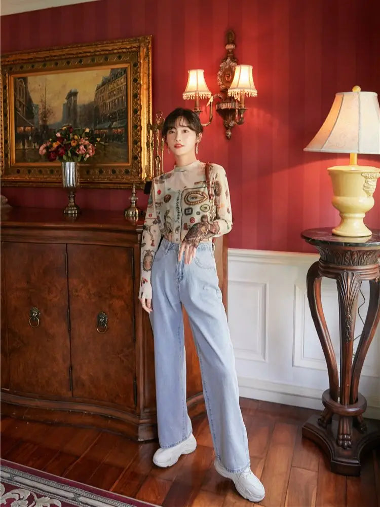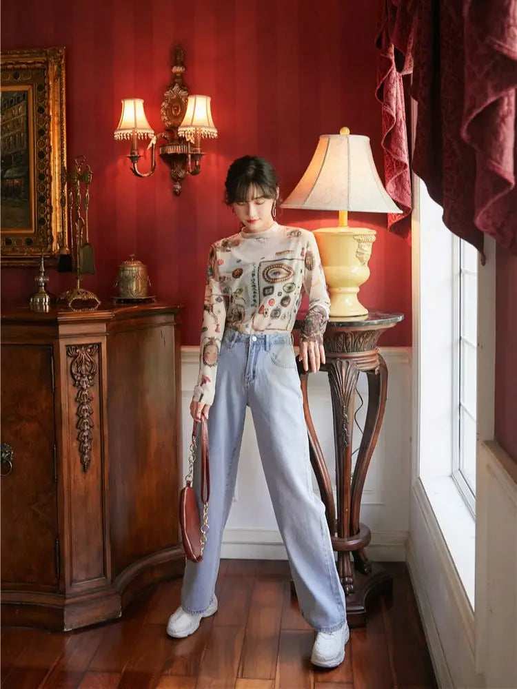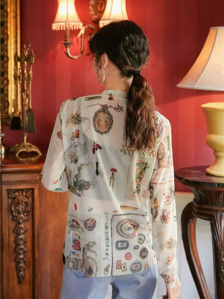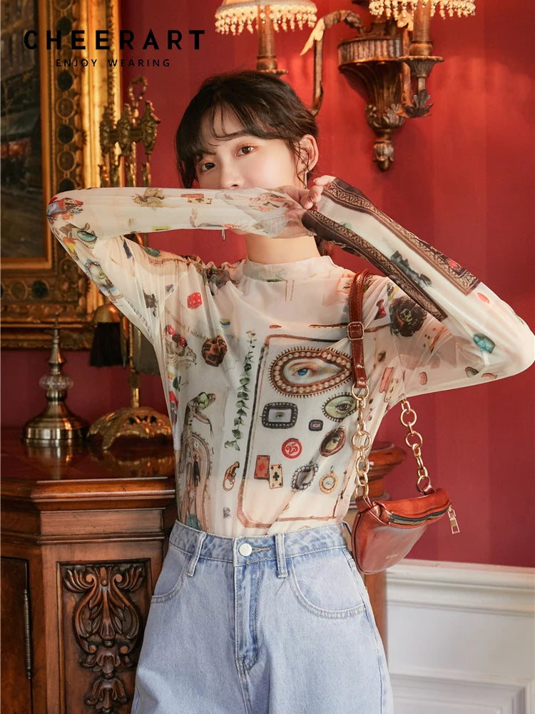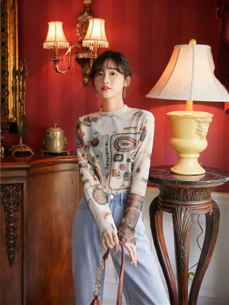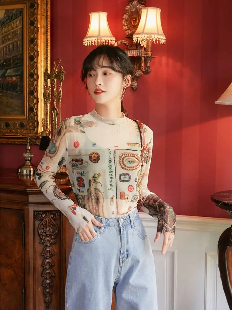 Mystical Graphic Long Sleeve Mesh Top
