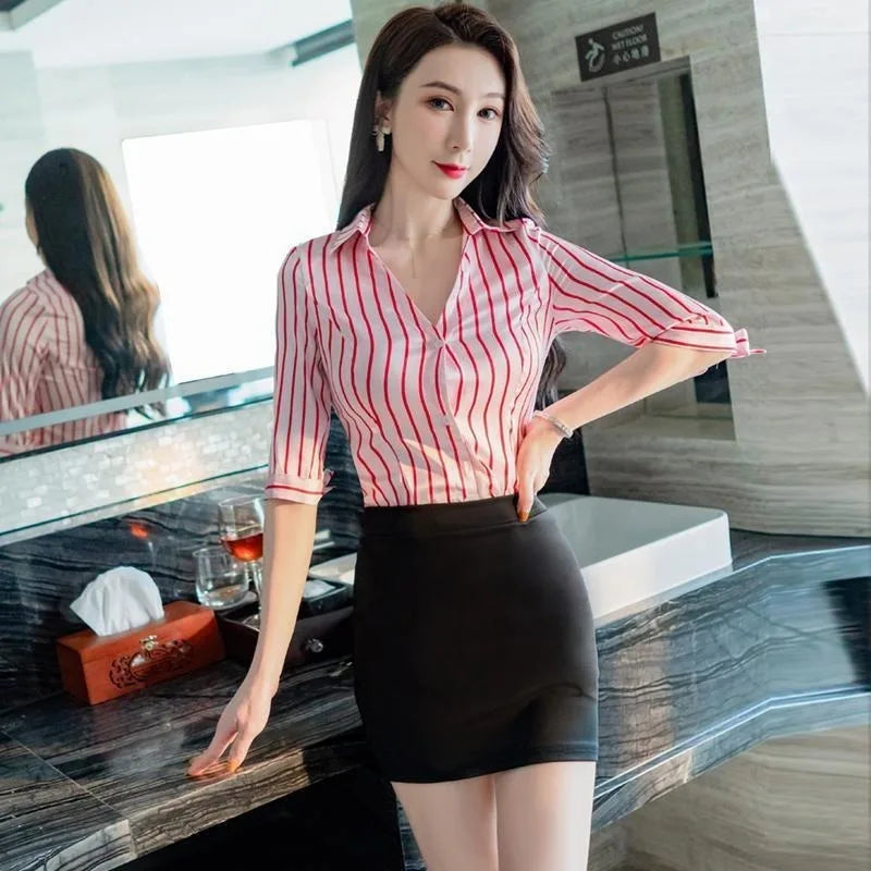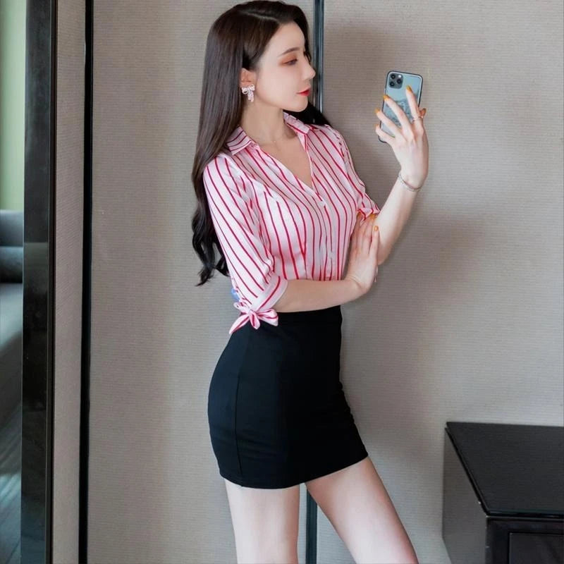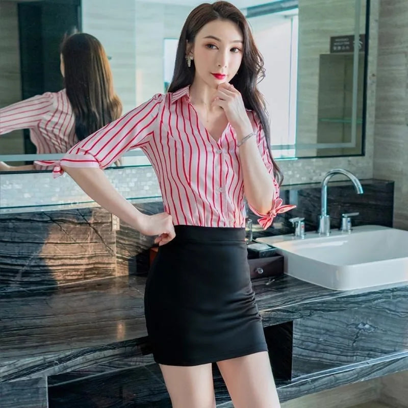 Striped Long Sleeve V-neck Shirt & Skirt Set