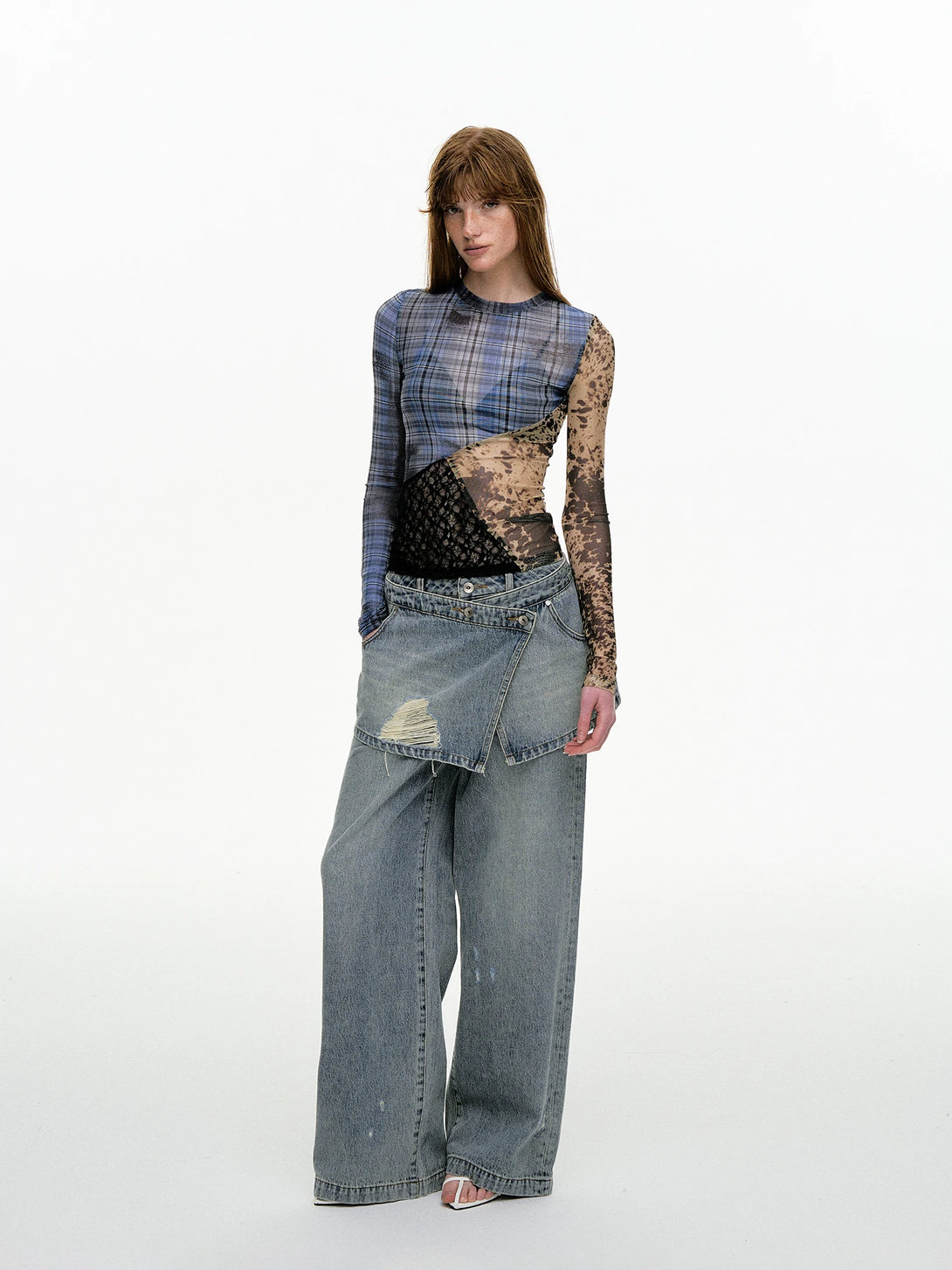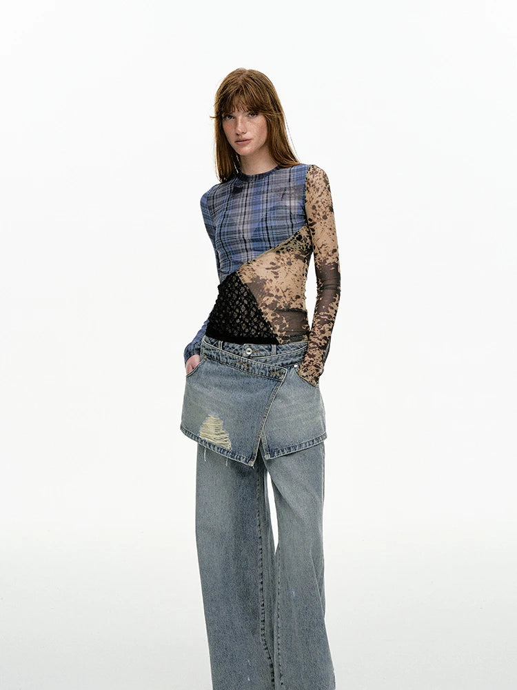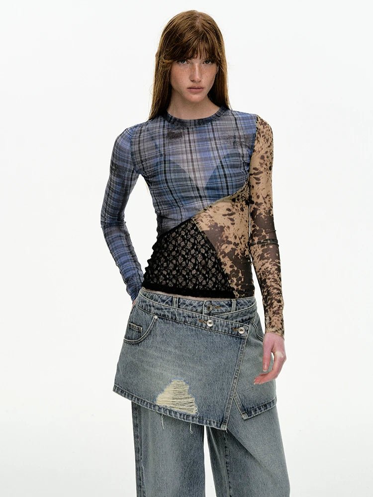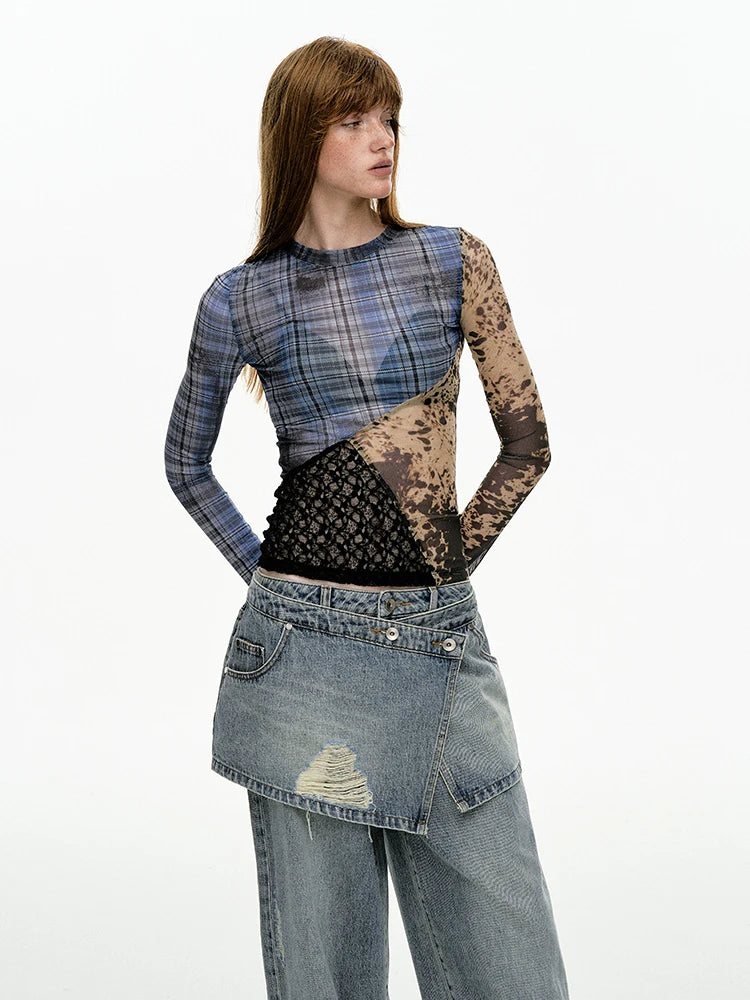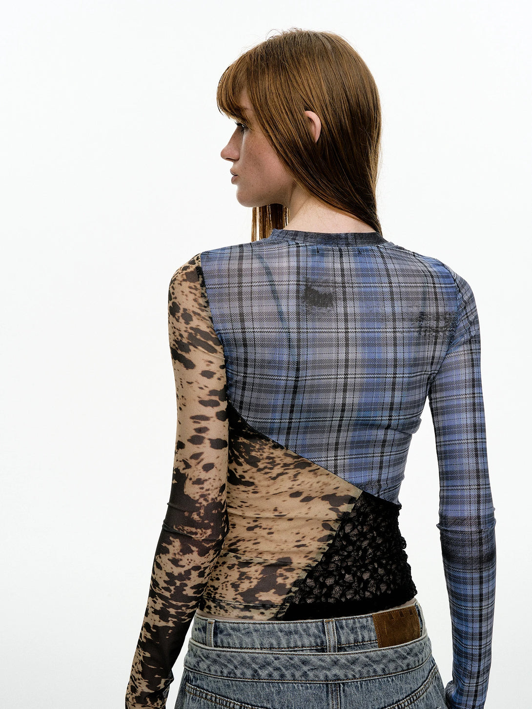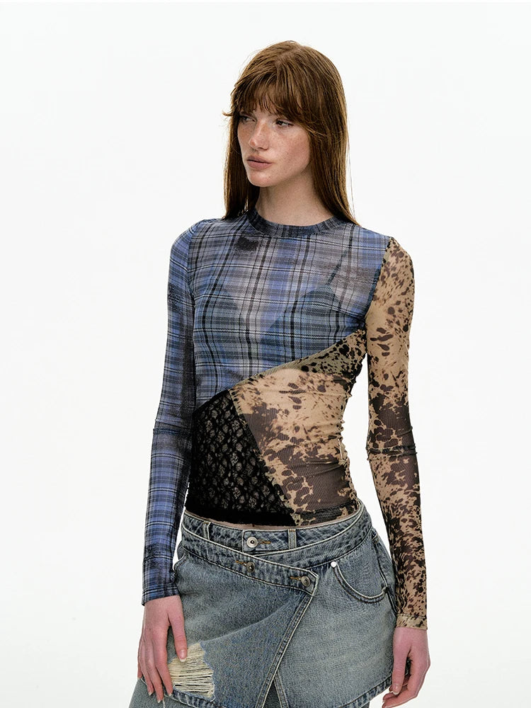 Stylish Plaid Mesh Patchwork Long Sleeve Top