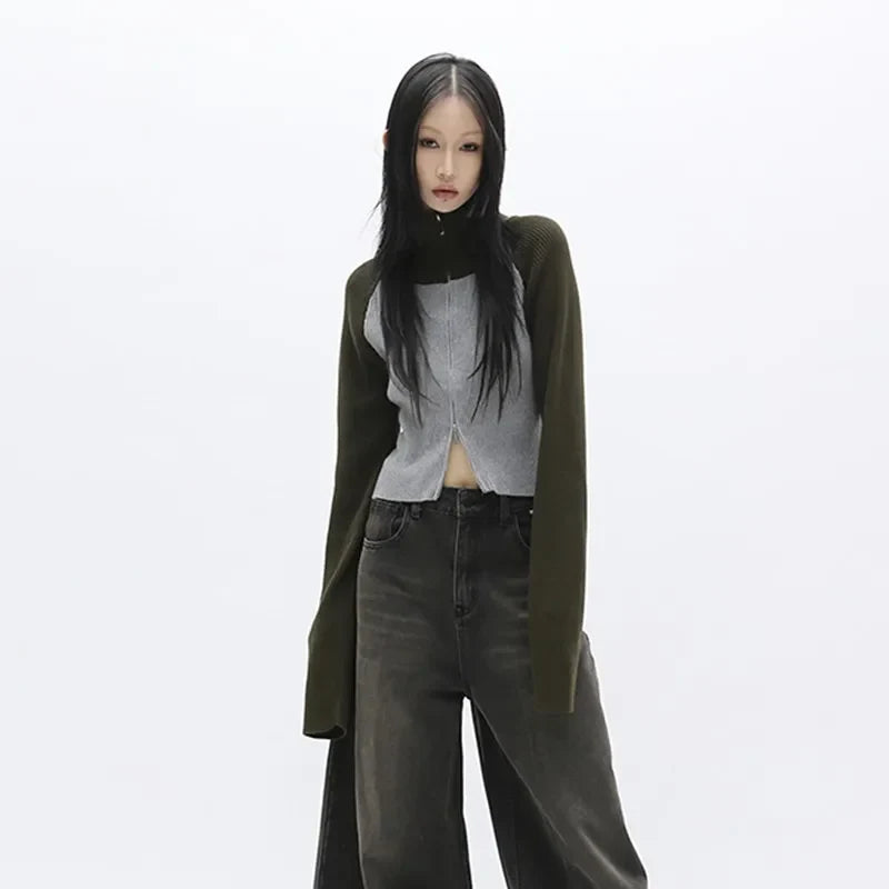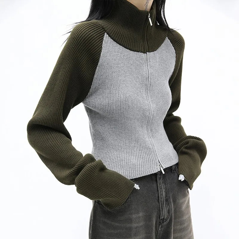 Vintage Grunge Patchwork Turtleneck Cardigan Coat